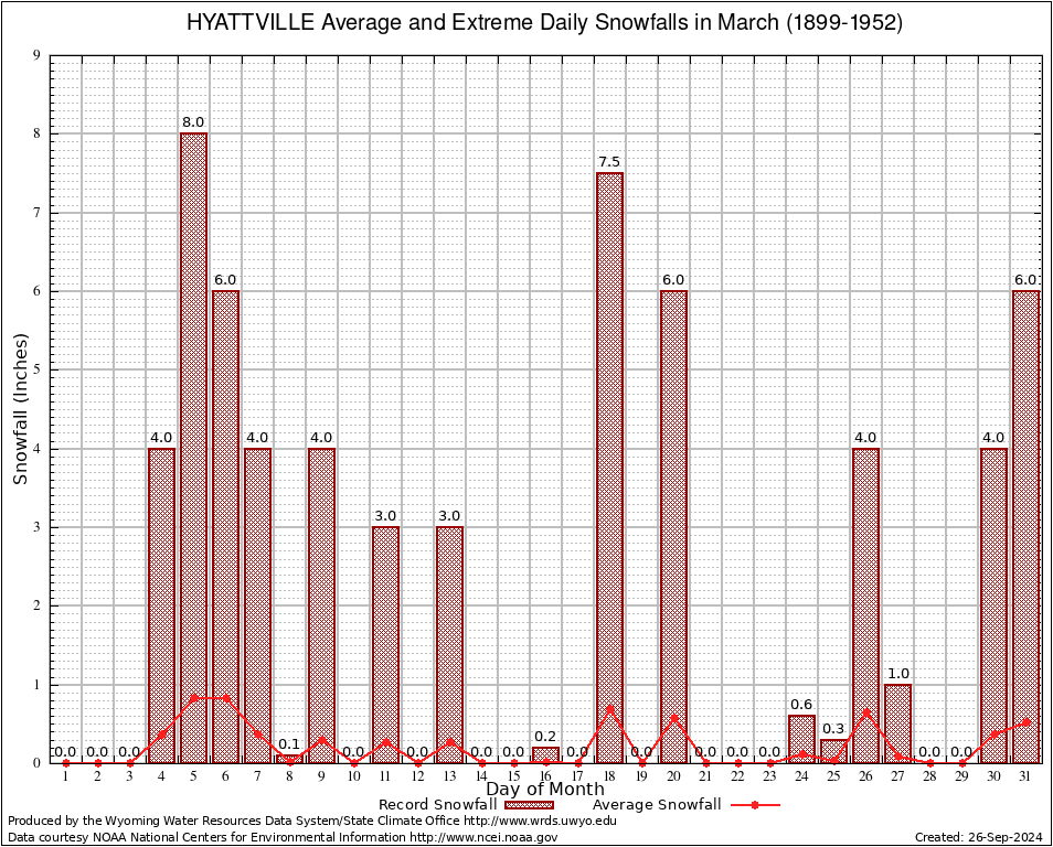 March Average and Extreme Daily Snowfall AMounts (1899-1952)
