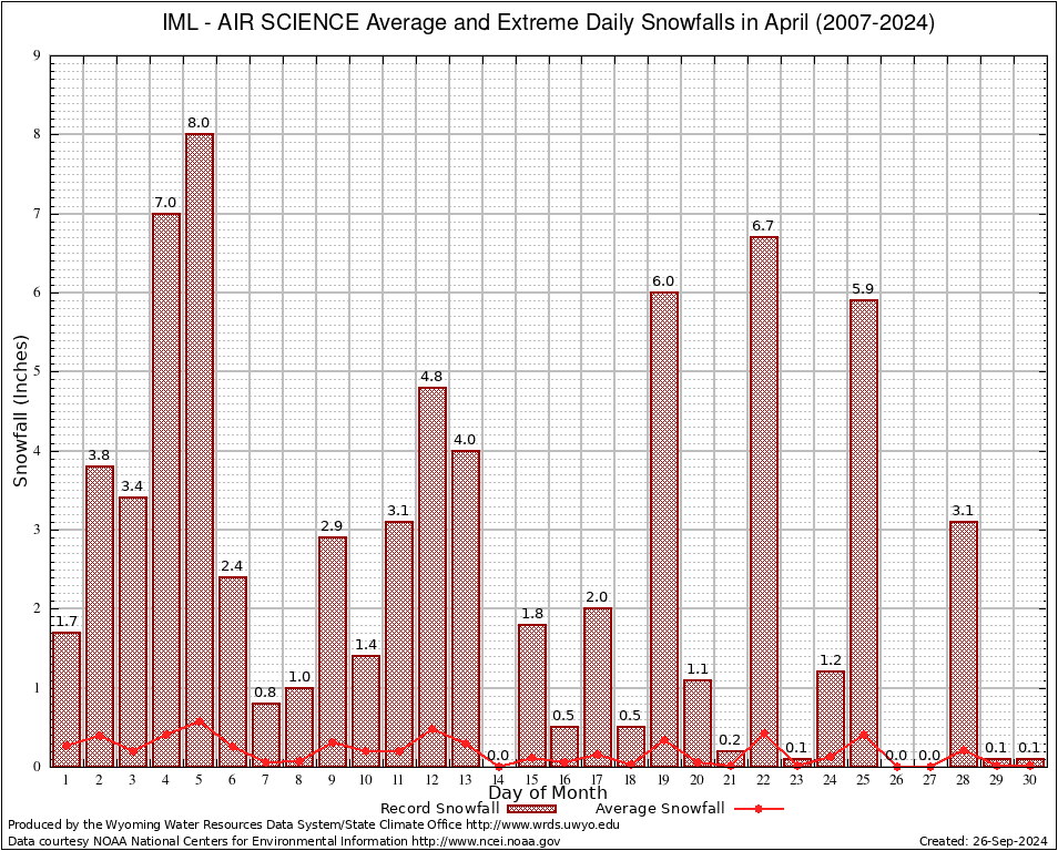 April Average and Extreme Daily Snowfall AMounts (2007-2024)