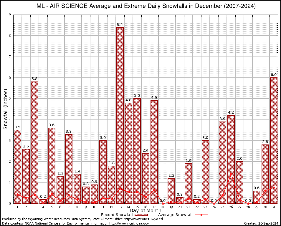 December Average and Extreme Daily Snowfall AMounts (2007-2024)