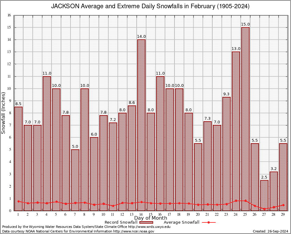 JACKSON (484910) February Average and Extreme Daily Snowfall AMounts (1905-2024) To index page for JACKSON