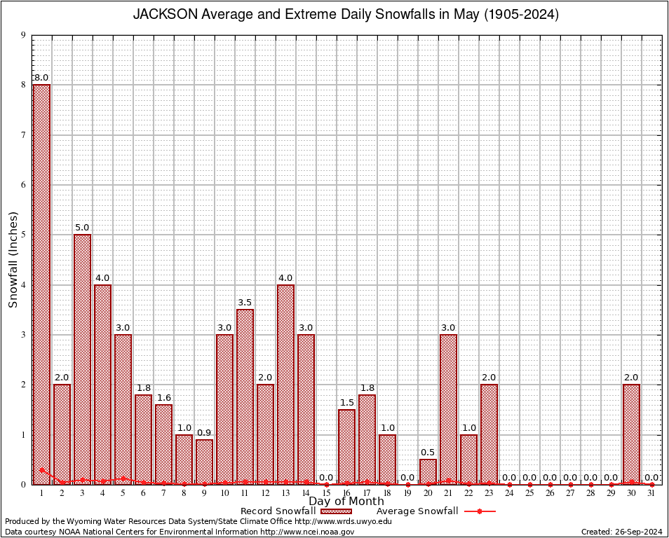 JACKSON (484910) May Average and Extreme Daily Snowfall AMounts (1905-2024) To index page for JACKSON