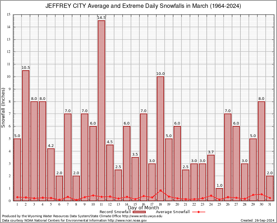 March Average and Extreme Daily Snowfall AMounts (1964-2024)