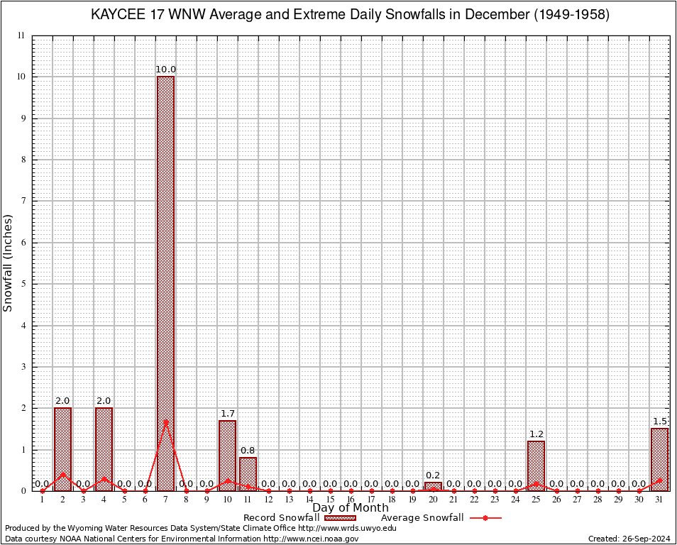 December Average and Extreme Daily Snowfall AMounts (1949-1958)