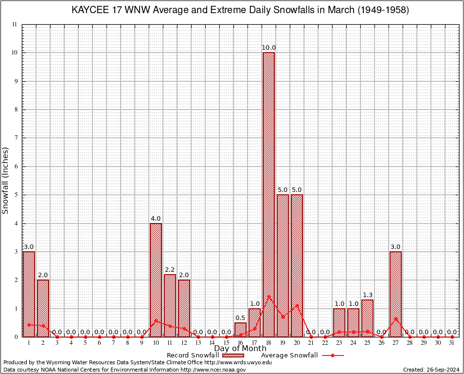 March Average and Extreme Daily Snowfall AMounts (1949-1958)