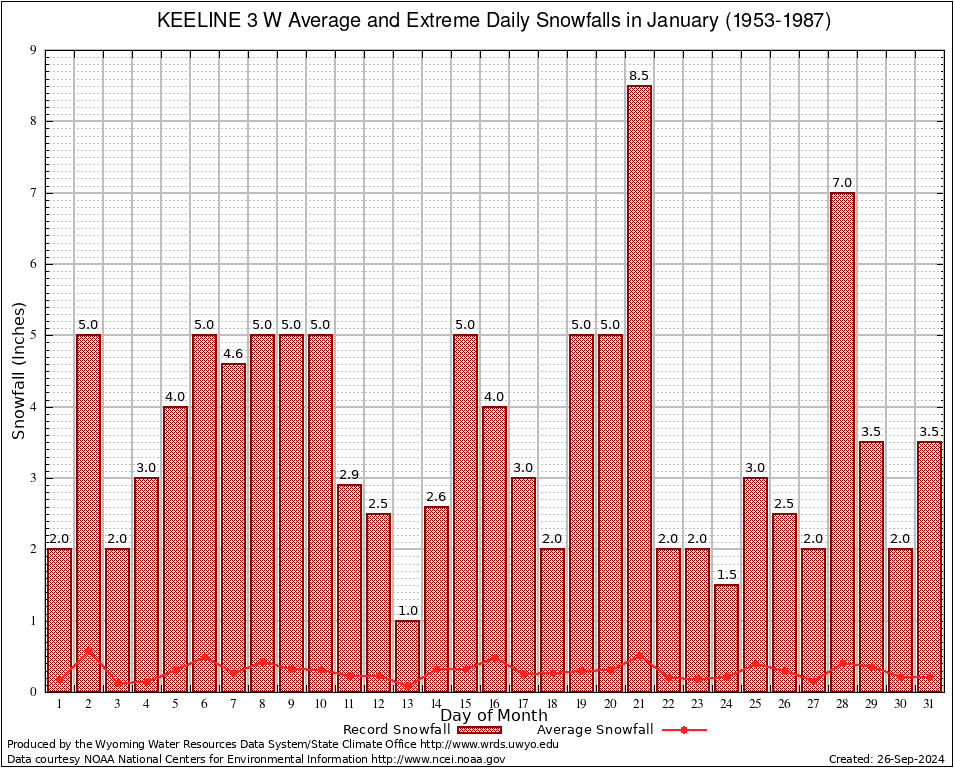 January Average and Extreme Daily Snowfall AMounts (1953-1987)