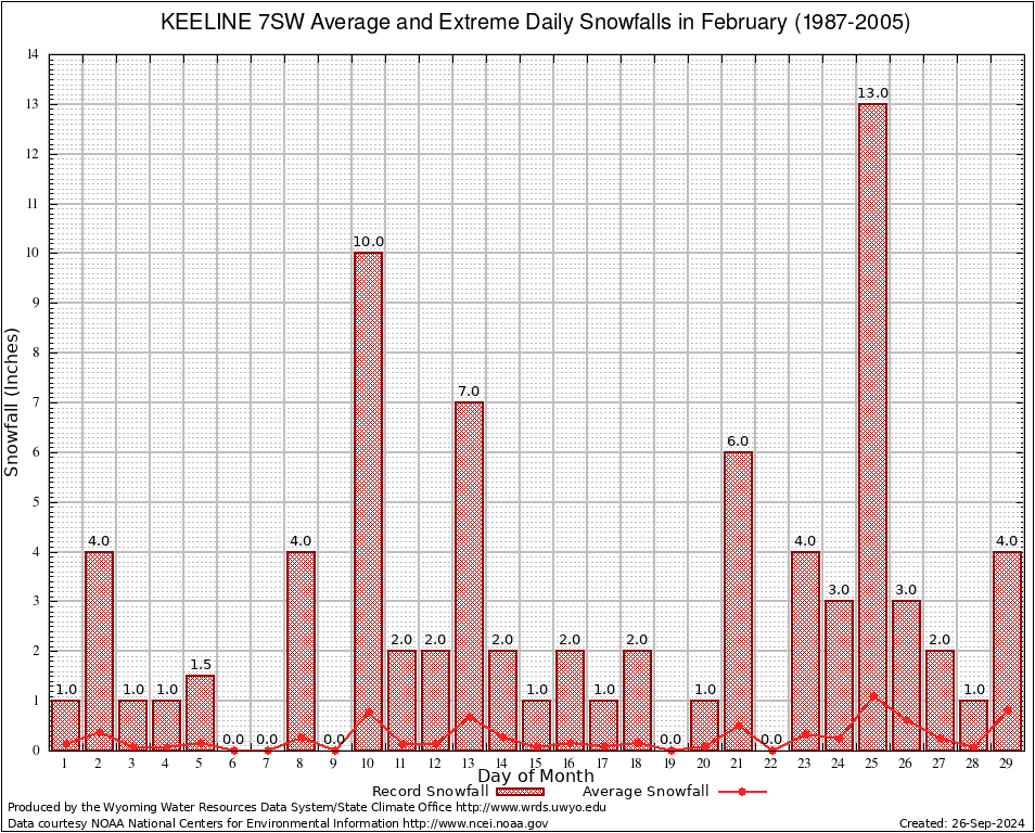 February Average and Extreme Daily Snowfall AMounts (1987-2005)