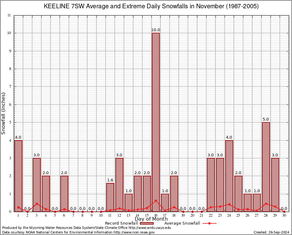 November Average and Extreme Daily Snowfall AMounts (1987-2005)