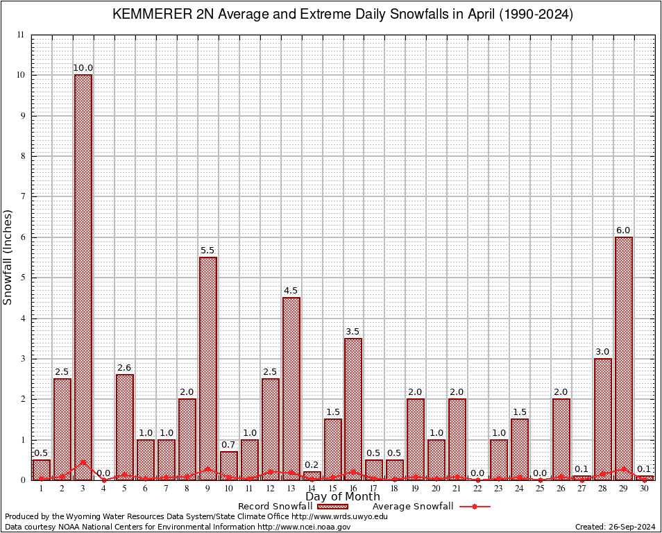 April Average and Extreme Daily Snowfall AMounts (1990-2024)