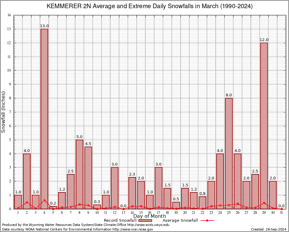 March Average and Extreme Daily Snowfall AMounts (1990-2024)