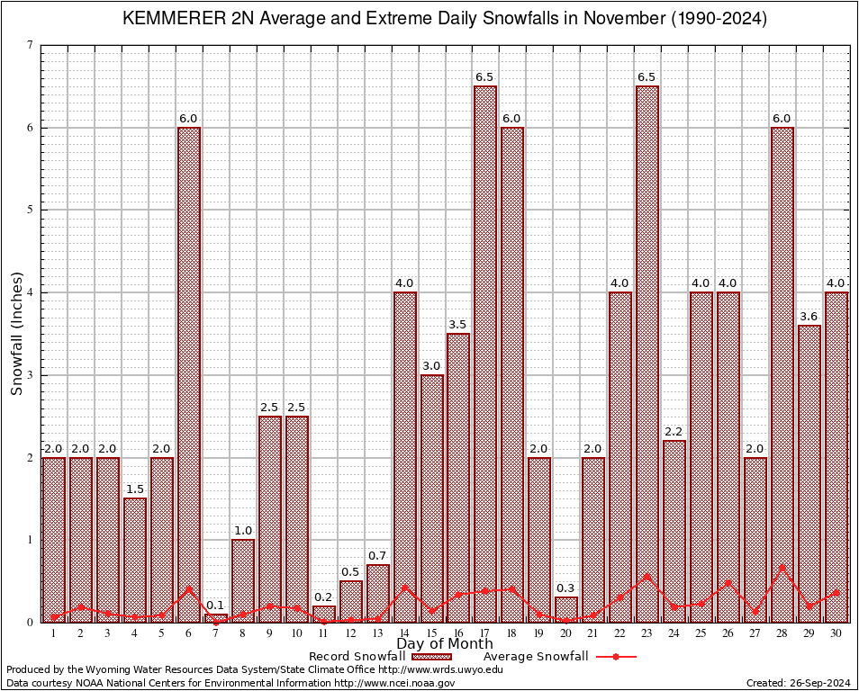 November Average and Extreme Daily Snowfall AMounts (1990-2024)