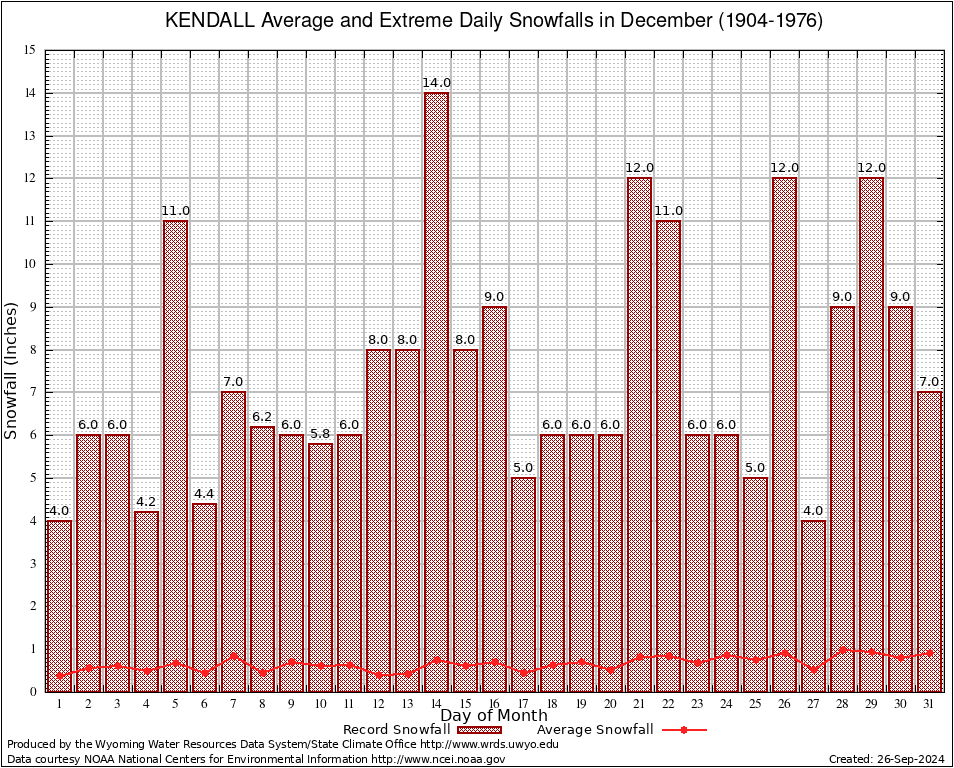 KENDALL (485115) December Average and Extreme Daily Snowfall AMounts (1904-1976) To index page for KENDALL