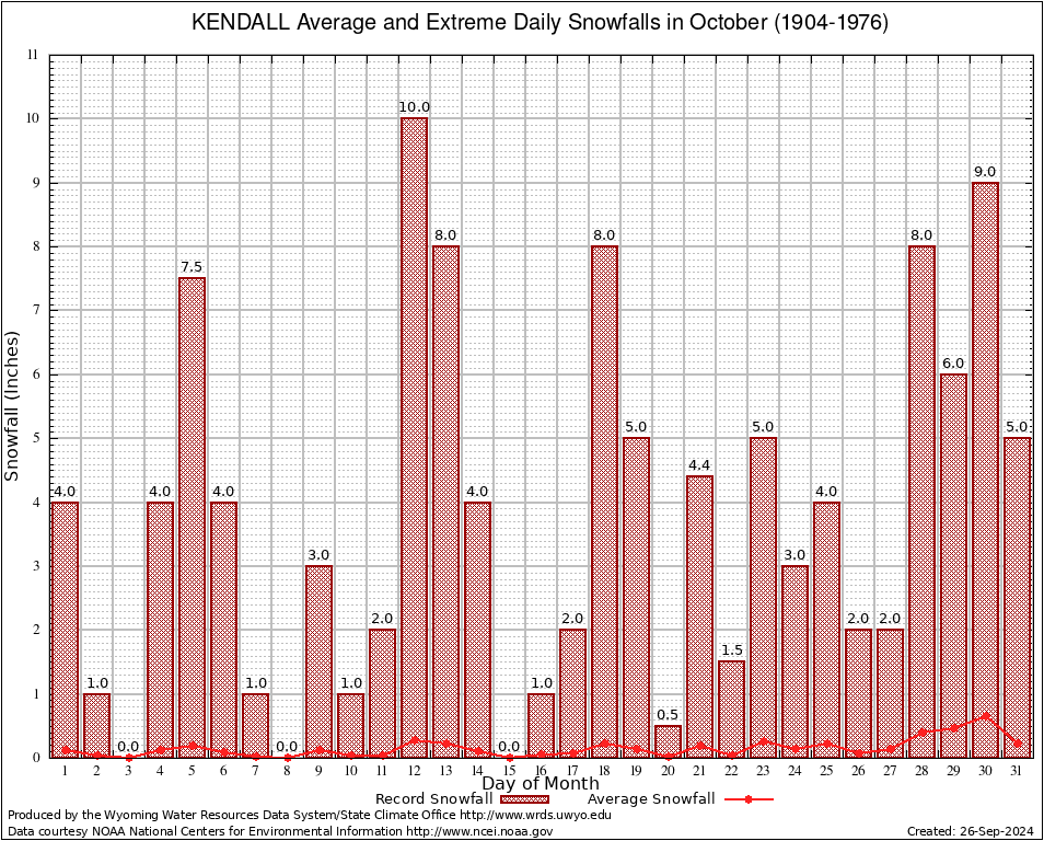 KENDALL (485115) October Average and Extreme Daily Snowfall AMounts (1904-1976) To index page for KENDALL