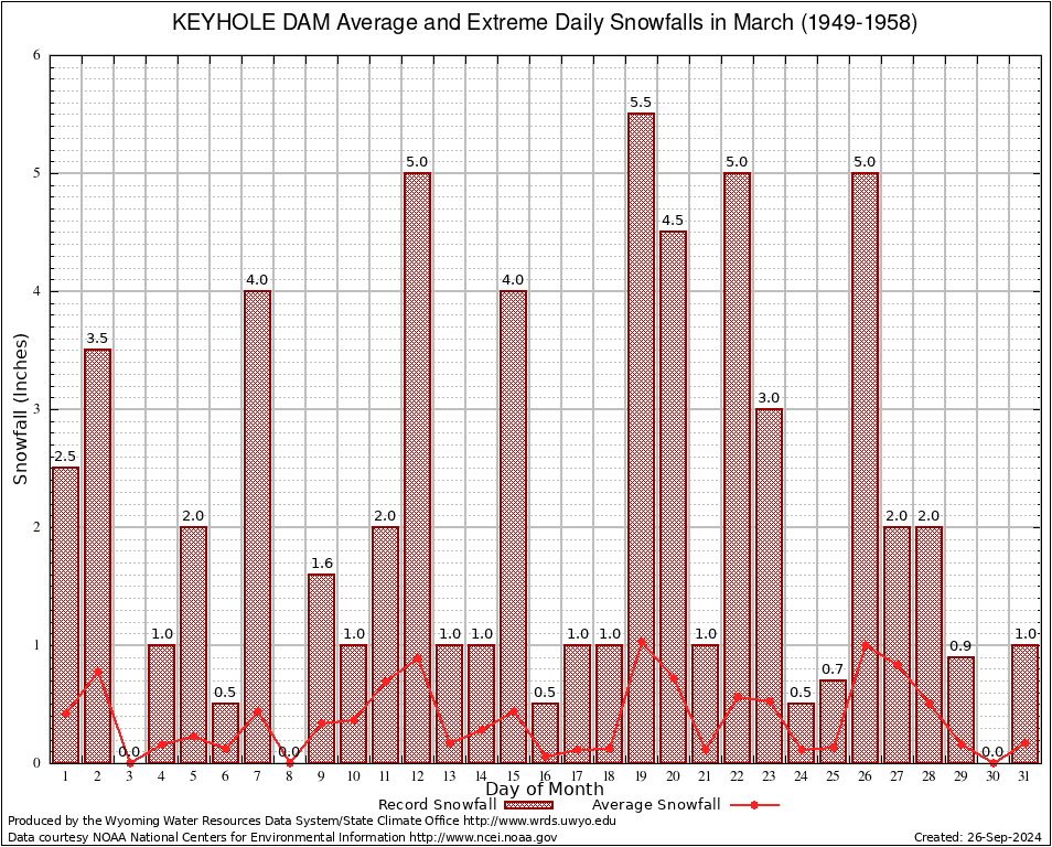 March Average and Extreme Daily Snowfall AMounts (1949-1958)