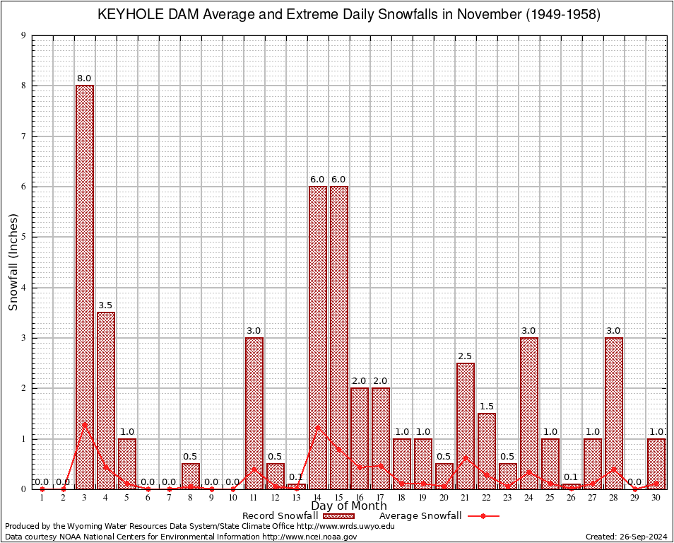 November Average and Extreme Daily Snowfall AMounts (1949-1958)