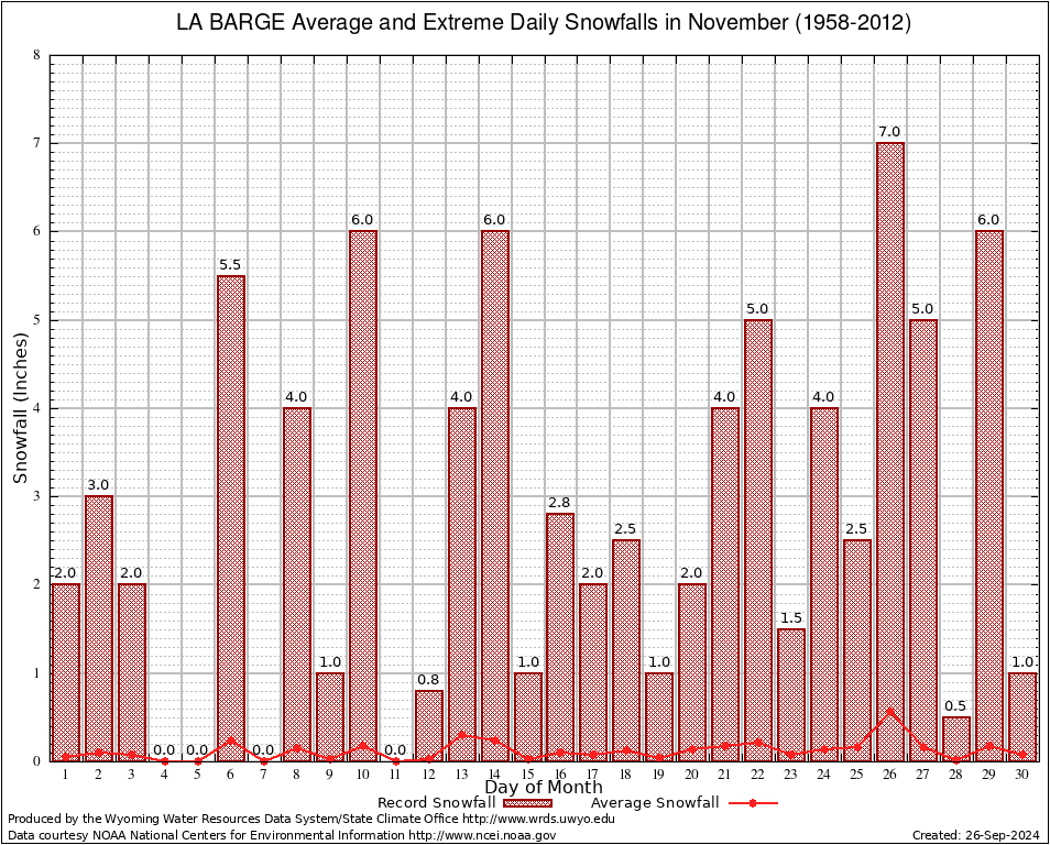 LA BARGE (485252) November Average and Extreme Daily Snowfall AMounts (1958-2012) To index page for LA BARGE