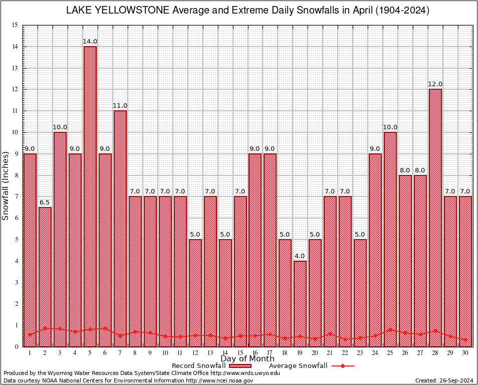 April Average and Extreme Daily Snowfall AMounts (1904-2024)