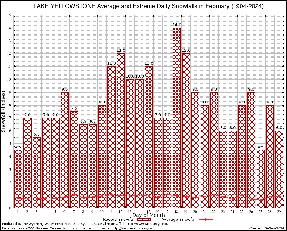 February Average and Extreme Daily Snowfall AMounts (1904-2024)
