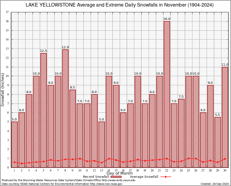 November Average and Extreme Daily Snowfall AMounts (1904-2024)