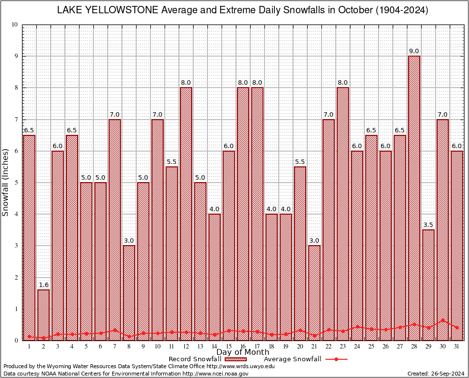 October Average and Extreme Daily Snowfall AMounts (1904-2024)