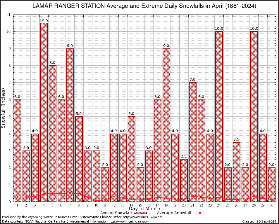 April Average and Extreme Daily Snowfall AMounts (1881-2024)