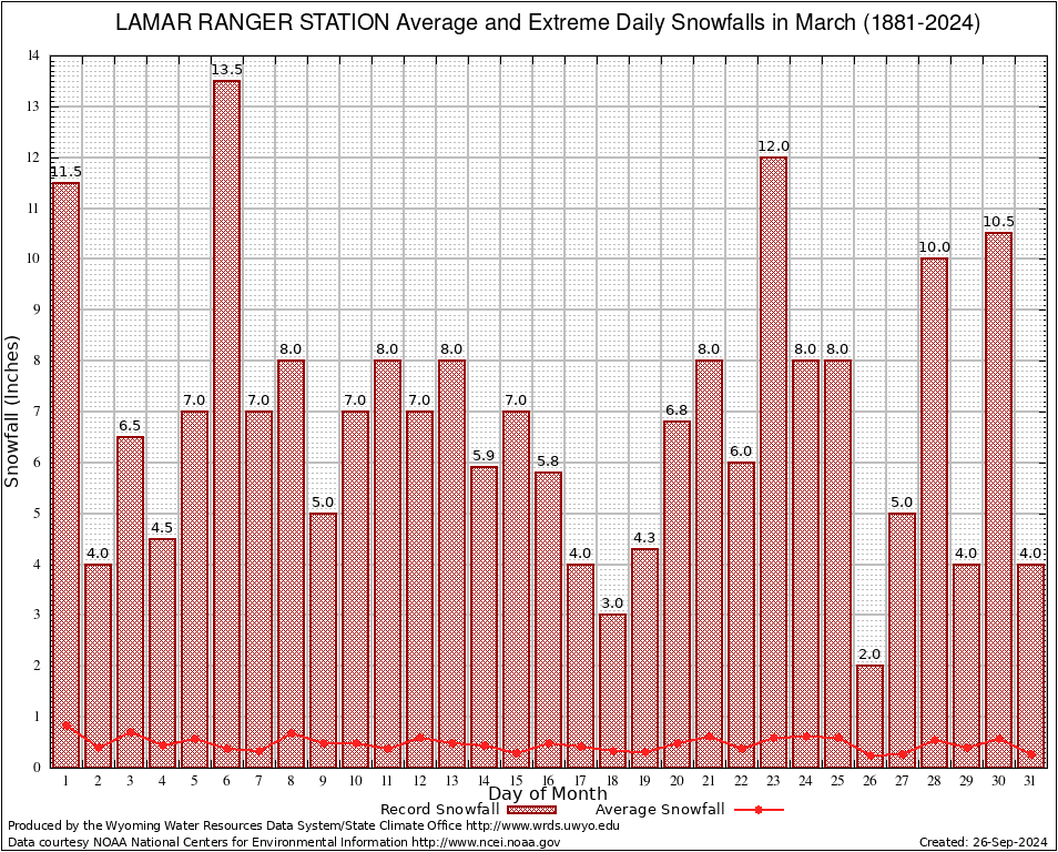 March Average and Extreme Daily Snowfall AMounts (1881-2024)