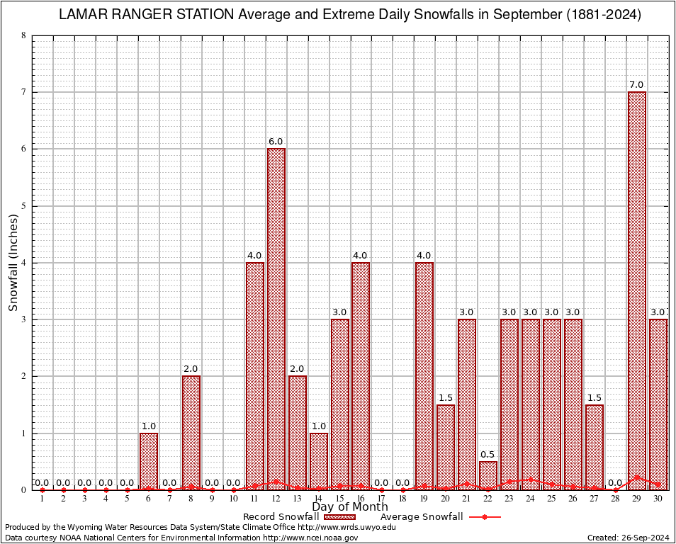 September Average and Extreme Daily Snowfall AMounts (1881-2024)