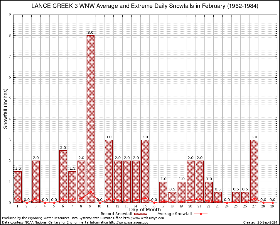 February Average and Extreme Daily Snowfall AMounts (1962-1984)