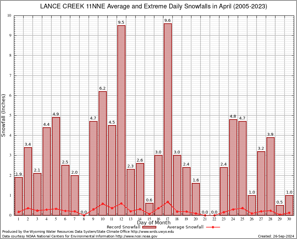 April Average and Extreme Daily Snowfall AMounts (2005-2023)