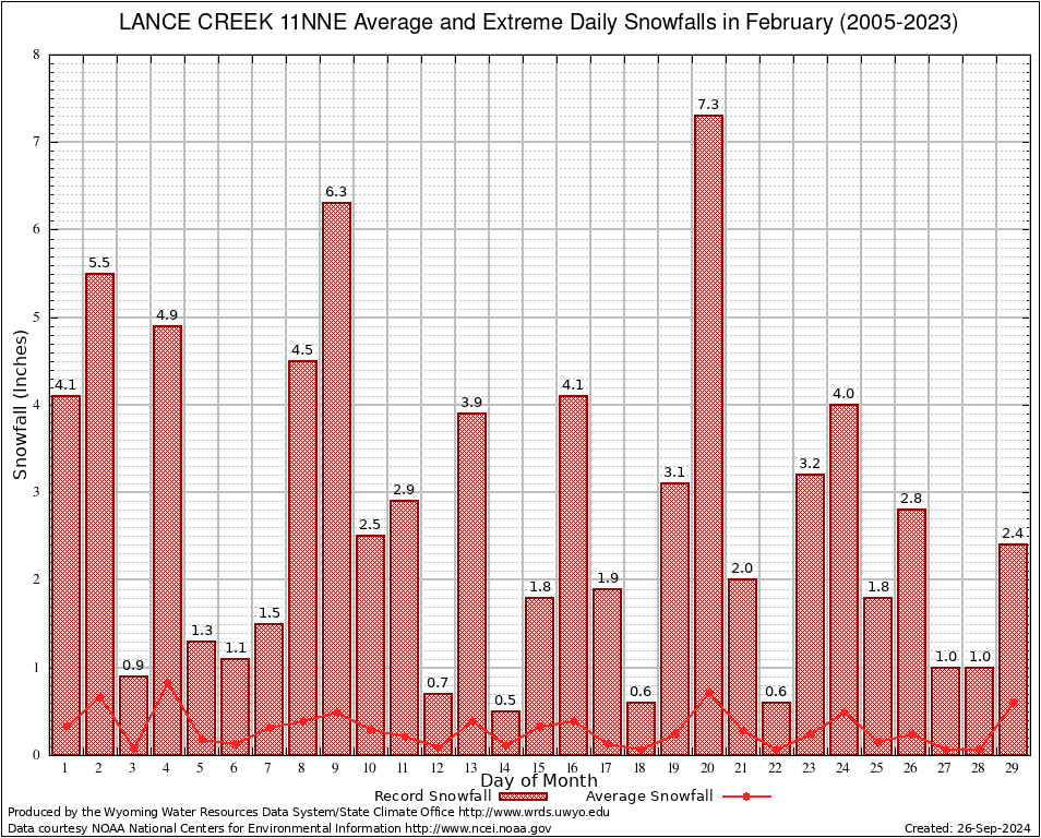 February Average and Extreme Daily Snowfall AMounts (2005-2023)