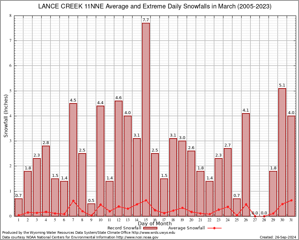 March Average and Extreme Daily Snowfall AMounts (2005-2023)