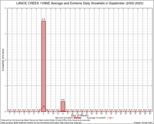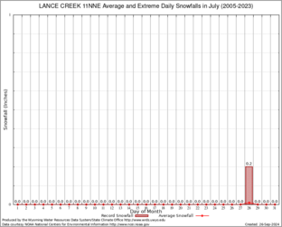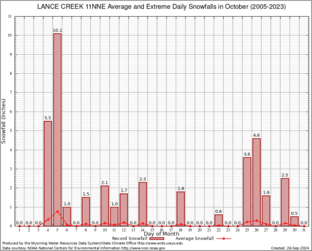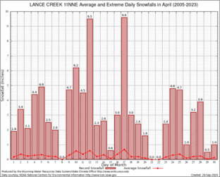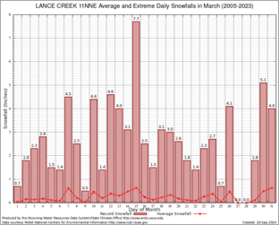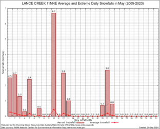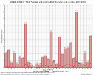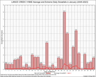LANCE CREEK 11NNE (485374) Record Extreme and Average Daily Snowfall (2005-2023) See Here for Other Stations