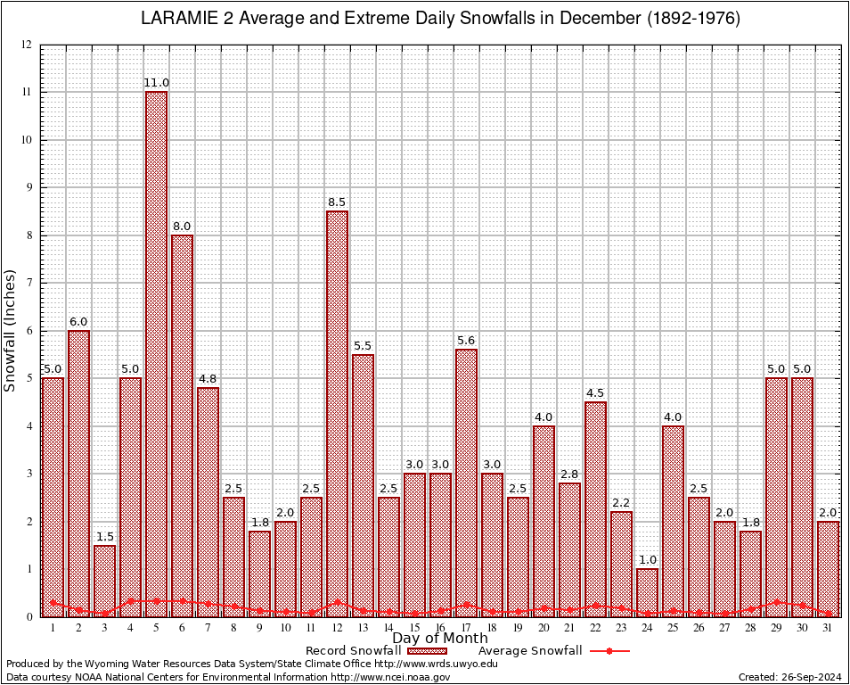 LARAMIE 2 (485411) December Average and Extreme Daily Snowfall AMounts (1892-1976) To index page for LARAMIE 2