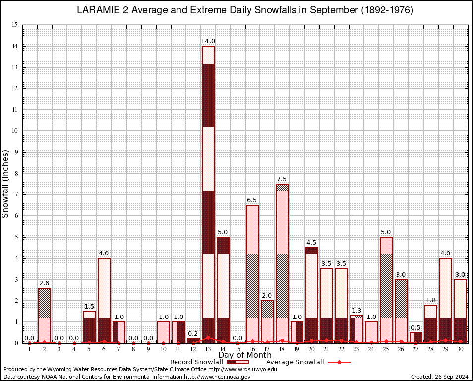 LARAMIE 2 (485411) September Average and Extreme Daily Snowfall AMounts (1892-1976) To index page for LARAMIE 2