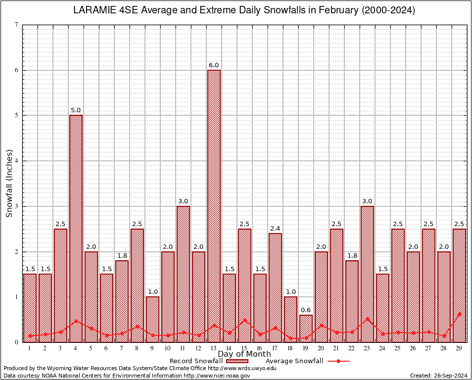 February Average and Extreme Daily Snowfall AMounts (2000-2024)