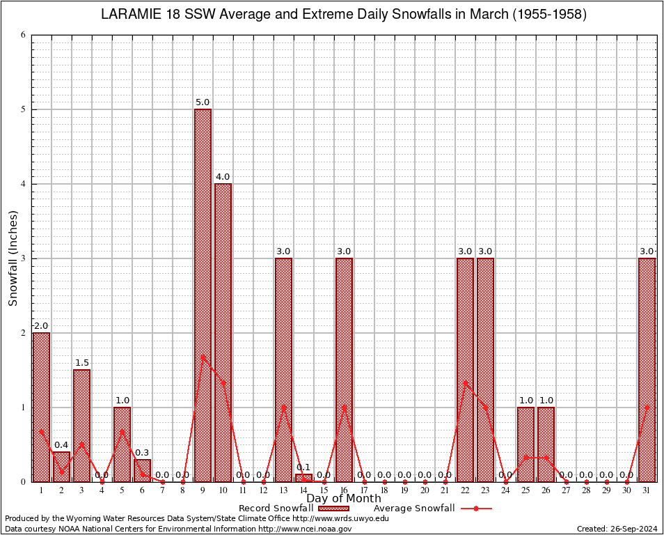 March Average and Extreme Daily Snowfall AMounts (1955-1958)
