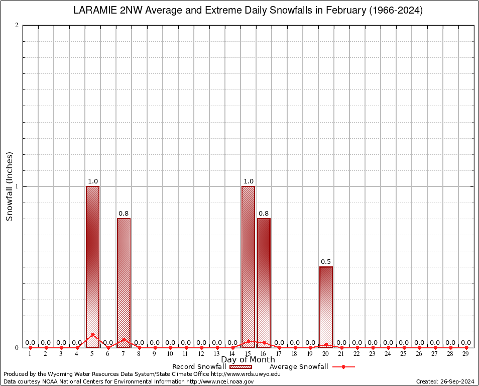 February Average and Extreme Daily Snowfall AMounts (1966-2024)