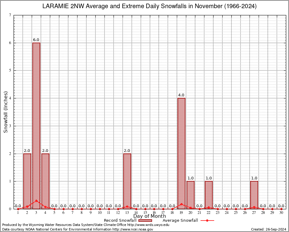 November Average and Extreme Daily Snowfall AMounts (1966-2024)