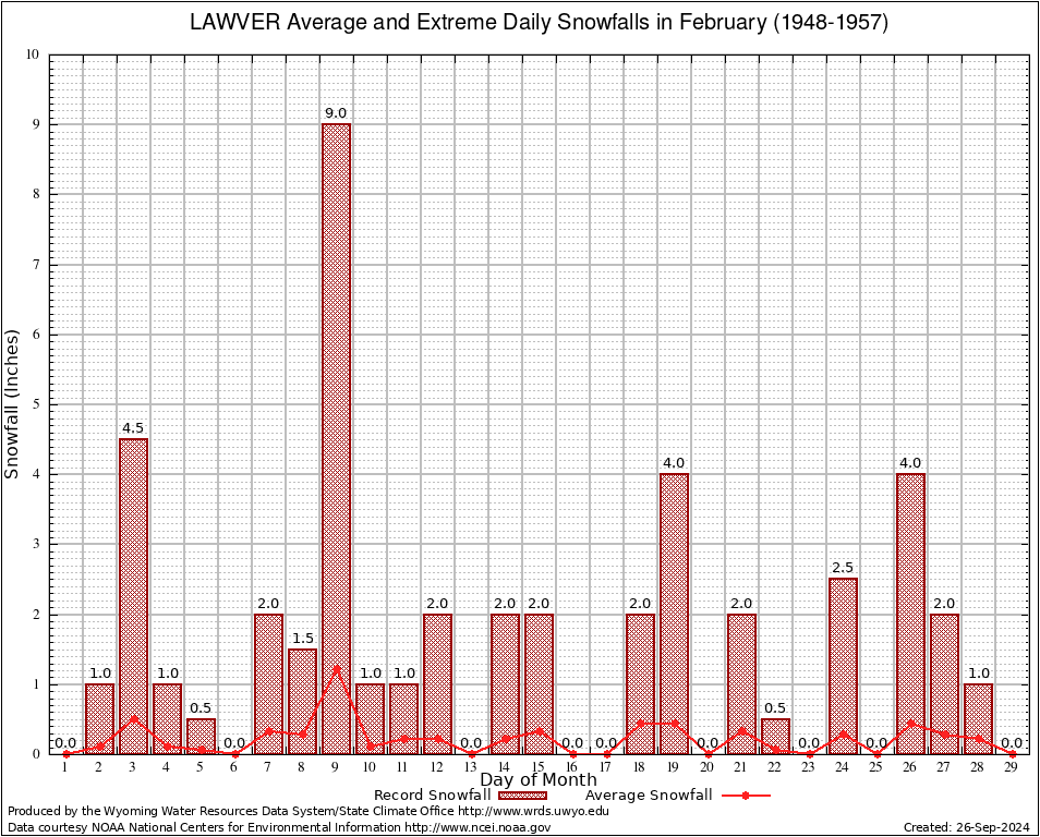 LAWVER (485465) February Average and Extreme Daily Snowfall AMounts (1948-1957) To index page for LAWVER