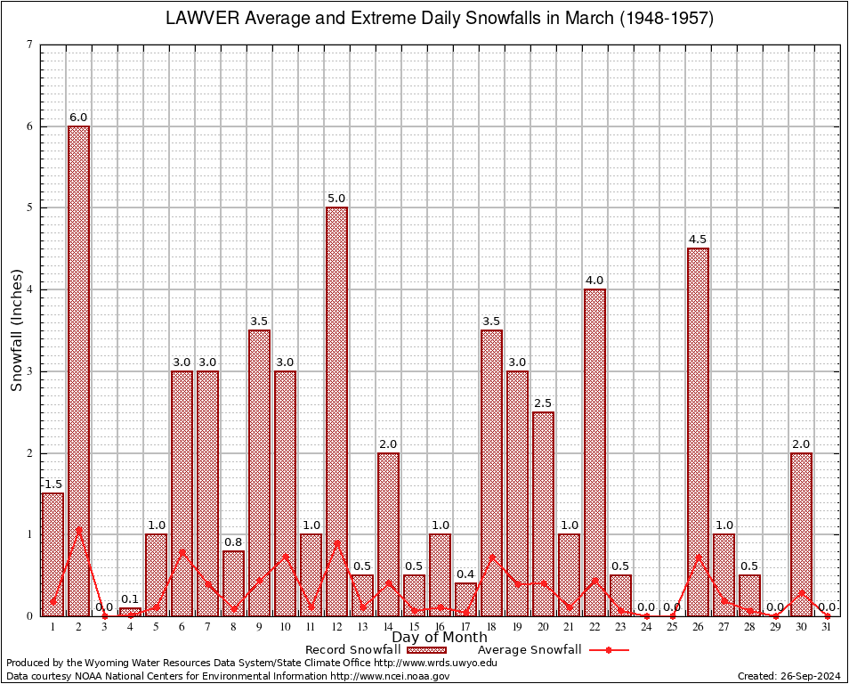 LAWVER (485465) March Average and Extreme Daily Snowfall AMounts (1948-1957) To index page for LAWVER