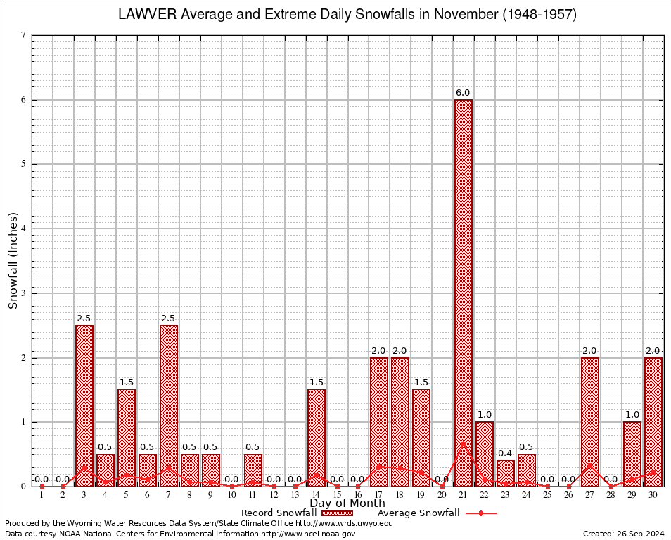 LAWVER (485465) November Average and Extreme Daily Snowfall AMounts (1948-1957) To index page for LAWVER