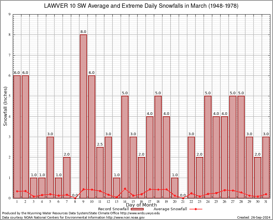 March Average and Extreme Daily Snowfall AMounts (1948-1978)