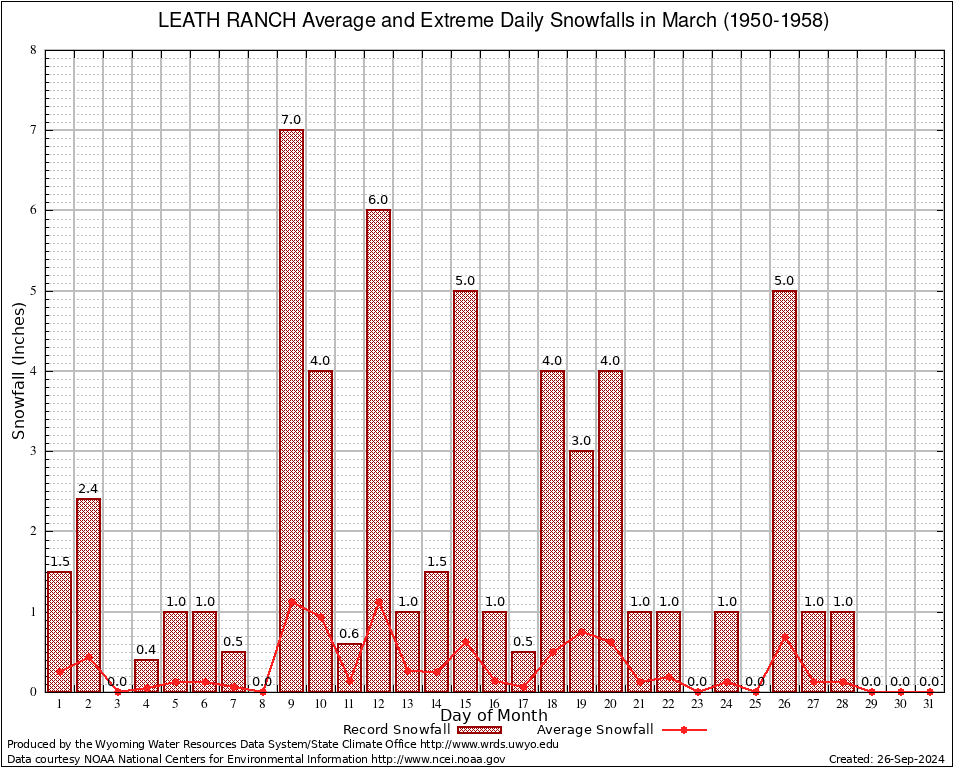 March Average and Extreme Daily Snowfall AMounts (1950-1958)