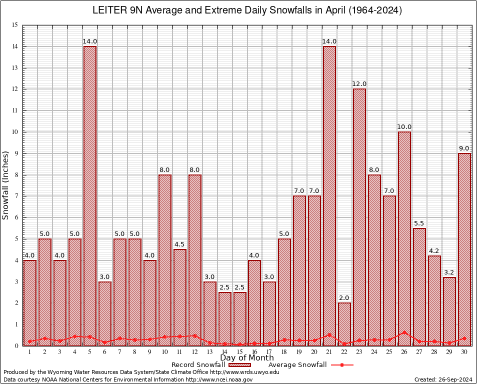 April Average and Extreme Daily Snowfall AMounts (1964-2024)