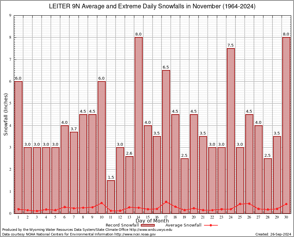 LEITER 9N (485506) November Average and Extreme Daily Snowfall AMounts (1964-2024) To index page for LEITER 9N