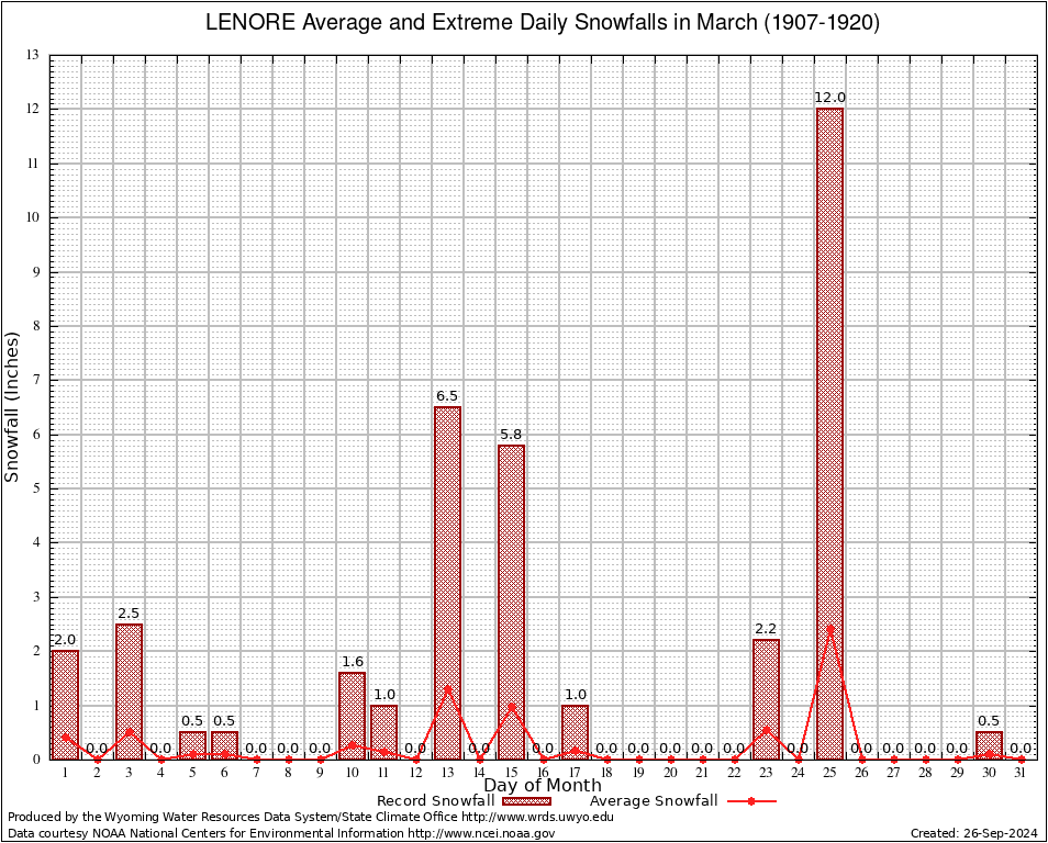 LENORE (485515) March Average and Extreme Daily Snowfall AMounts (1907-1920) To index page for LENORE