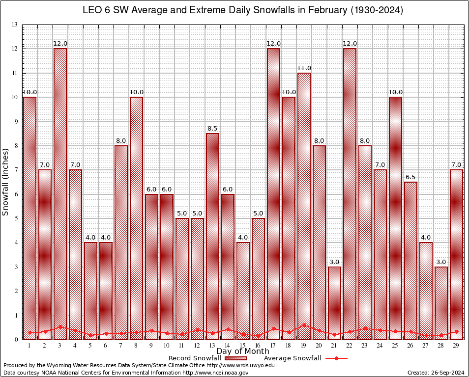 LEO 6 SW (485525) February Average and Extreme Daily Snowfall AMounts (1930-2024) To index page for LEO 6 SW