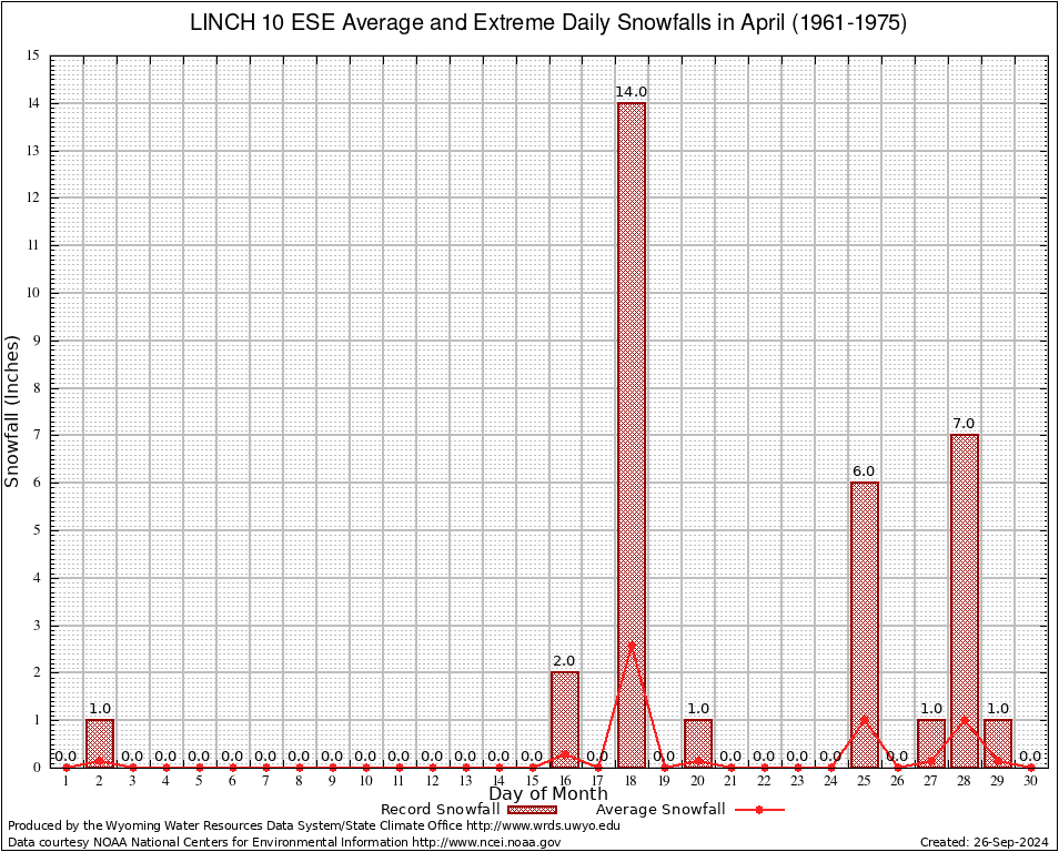 April Average and Extreme Daily Snowfall AMounts (1961-1975)