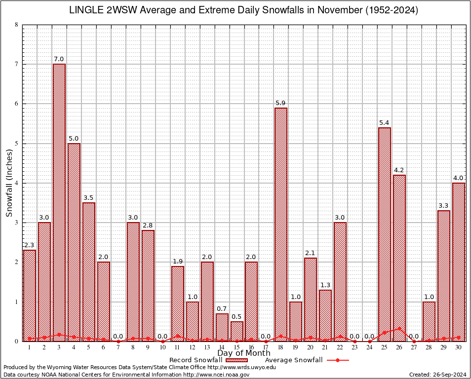 November Average and Extreme Daily Snowfall AMounts (1952-2024)