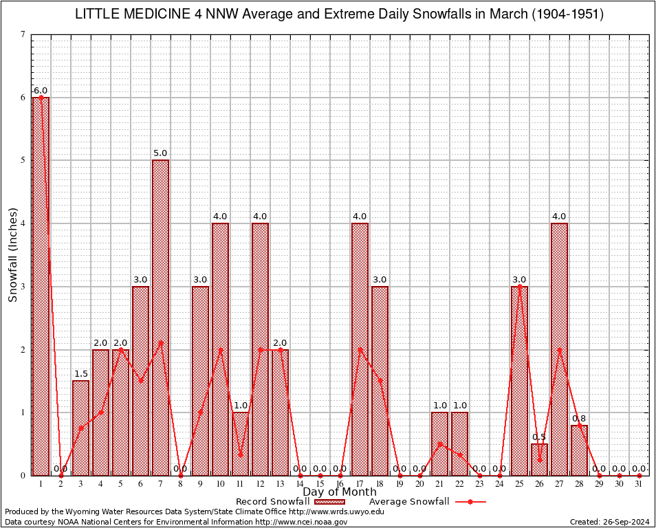 March Average and Extreme Daily Snowfall AMounts (1904-1951)