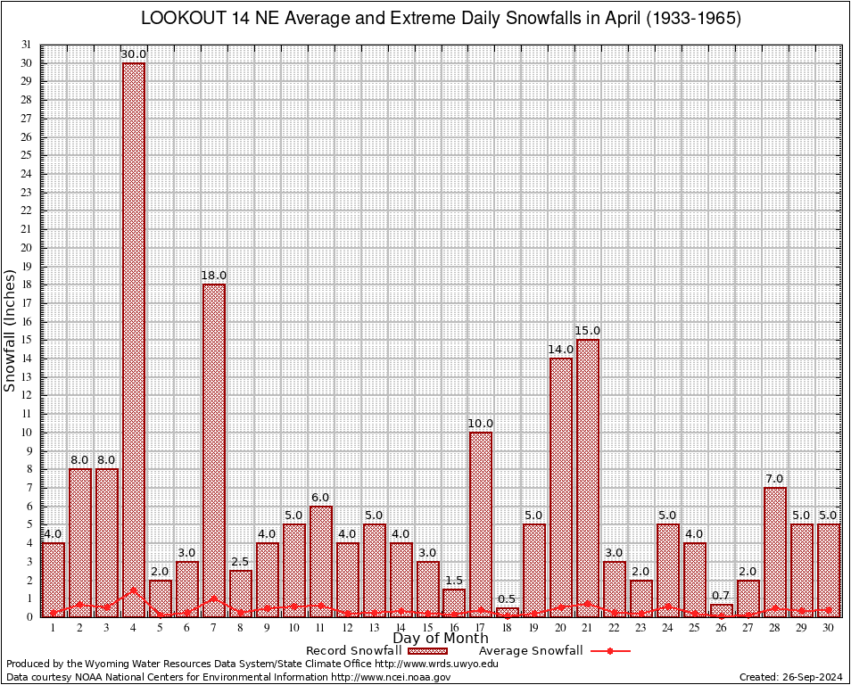 April Average and Extreme Daily Snowfall AMounts (1933-1965)
